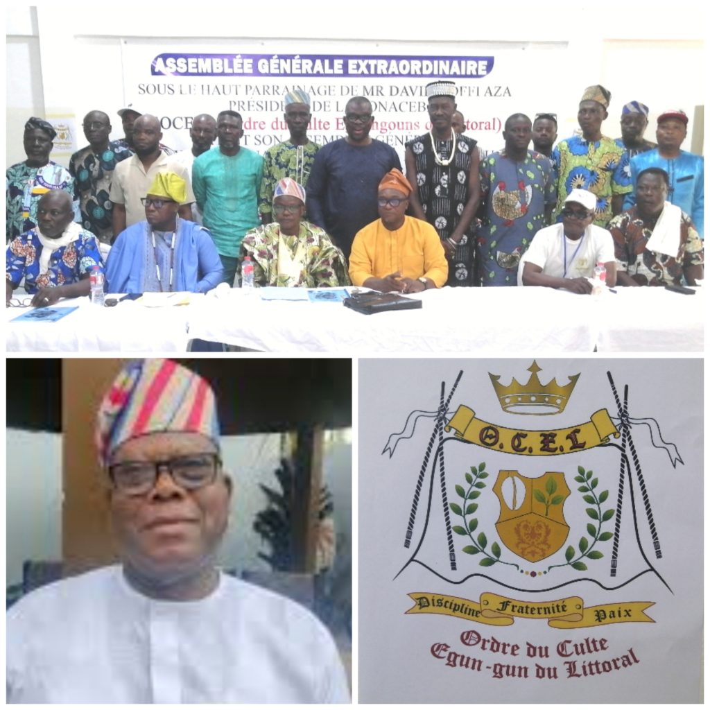 L’Ordre du Culte Egoungouns du Littoral (OCEL) du président Baba Salè Gabriel Guendéhou a tenu, ce samedi 25 avril 2026 à son siège situé à Kouhounou, Vons Azonhiho, une Assemblée Générale Extraordinaire placée sous le haut parrainage de Monsieur David Koffi Aza, Président de la CONACEB. Il était question pour les différentes sections de l’OCEL et les associations affiliées présente d’adopter et d’entériner les textes fondateurs de l’ordre pour une mise en conformité de celui-ci aux nouvelles réglementations régissant les associations au Bénin. C’était sous le regard et la coupole du présidium composé du vice-président Aristide Boco Adebayo, du Secrétaire Général, Blaise Michai, du Trésorier Eustache Guendéhou et du responsable chargé de la discipline, Ludovic Noudofindin.