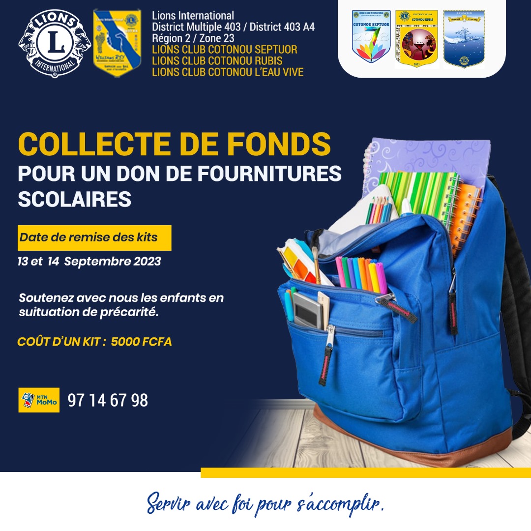 Prêter main forte et tendre une main secourable aux parents d’élèves en situation de précarité financière en cette veille de la rentrée des classes. C’est l’objectif que les membres des Lions Internationals « Cotonou Septuor, Cotonou Rubis et Cotonou L’Eau Vive » veulent atteindre , en initiant une activité de don de fournitures scolaires qui se déroulera du 13 au 14 septembre prochain. En prélude à cette cérémonie de remise de kits scolaires, ces trois Clubs de la région 2 de la zone 23 du district 403-A4 ont lancé une collecte de fonds aux fins de réussir cette activité. Toutes les bonnes volontés soucieuses de l’épanouissement et de la scolarisation des enfants en situation difficile sont priées d’apporter leur modeste contribution. Les souscriptions et don sont donc attendus.