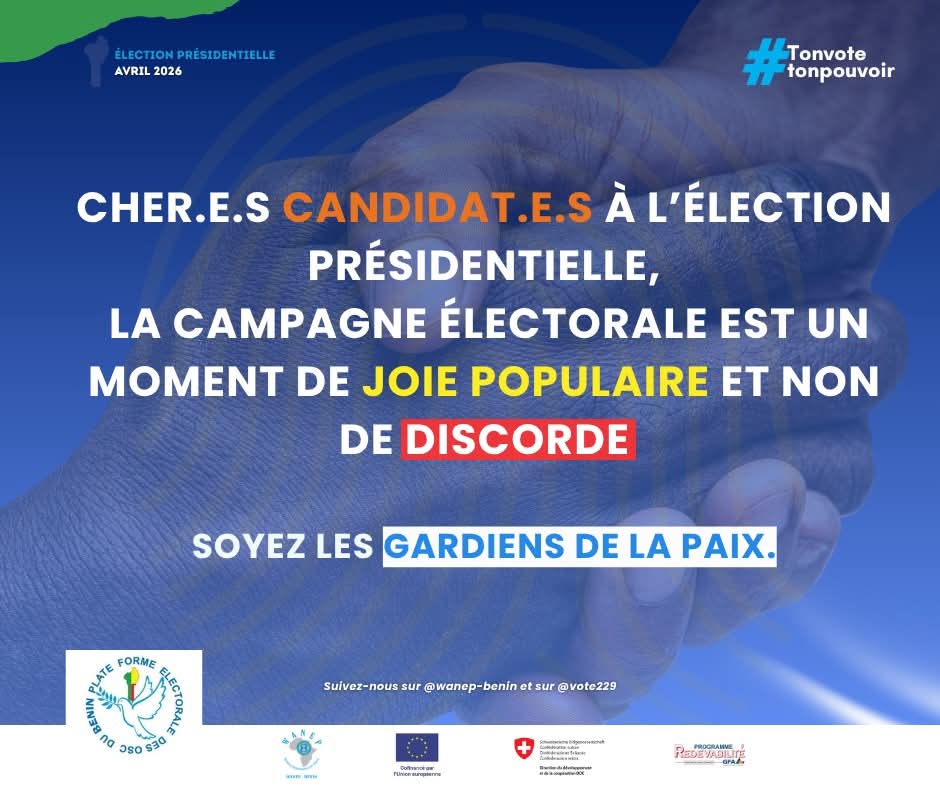 Portée par les organisations membres de la plateforme et coordonnée par WANEP-Bénin, cette campagne nationale d’éducation civique électorale ambitionne d’ancrer durablement les valeurs de paix, de tolérance et de vivre-ensemble au sein de la population béninoise. Elle met un accent particulier sur la maîtrise des règles électorales et la responsabilisation des acteurs politiques comme des citoyens.