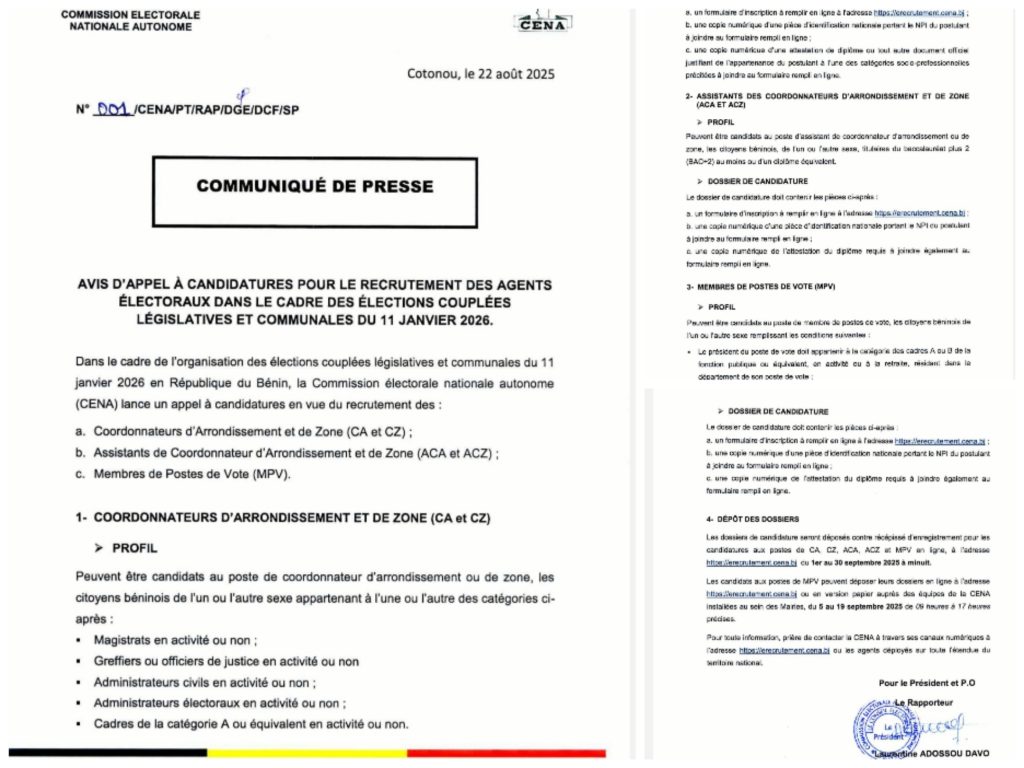 Dans la perspective des élections législatives et communales prévues pour le 11 janvier 2026, la Commission électorale nationale autonome (CENA) ouvre officiellement la phase de recrutement des agents électoraux. Coordonnateurs, assistants et membres des postes de vote sont invités à déposer leur candidature, afin de contribuer à la réussite d’un scrutin transparent et crédible sur toute l’étendue du territoire national.