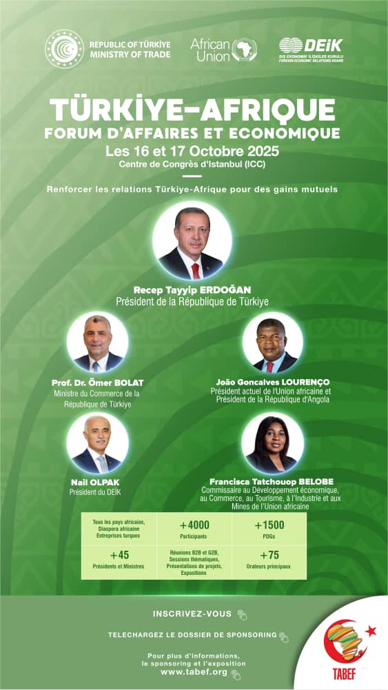 La cinquième édition du Forum d’Affaires et Économique Türkiye-Afrique (TABEF) se tiendra à Istanbul les 16 et 17 octobre prochains. Placé sous les auspices du ministère turc du Commerce et organisé par le Conseil des Relations Économiques Extérieures (DEİK) sous le coordination de l’Union Africaine, ce grand rendez-vous réunira les présidents Recep Tayyip Erdoğan de Türkiye et João Gonçalves Lourenço, président de l’Angola et de l’Union africaine, ainsi qu’un impressionnant panel de ministres, d’institutions financières internationales, de chambres de commerce et d’entrepreneurs venus de tout le continent.
