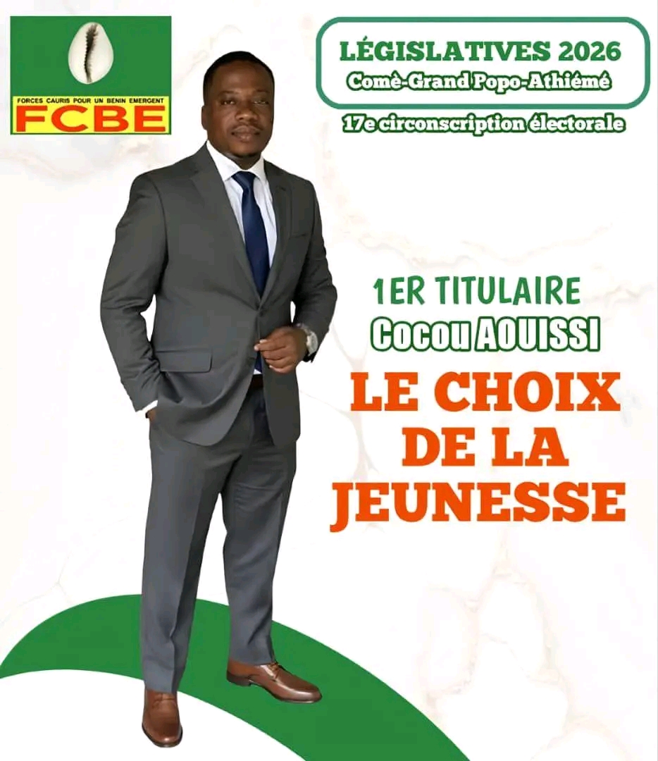 Dans la perspective des élections législatives de 2026, la 17e circonscription électorale, regroupant Comè, Grand-Popo et Athiémé, voit émerger une candidature portée par l’espoir et l’engagement de la jeunesse. Investi 1er titulaire sur la liste des Forces Cauris pour un Bénin Émergent (FCBE), Cocou AOUISSI s’affirme comme le choix de la jeunesse.
