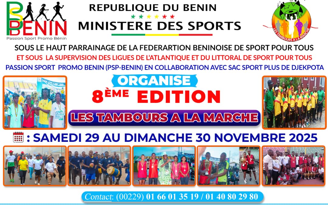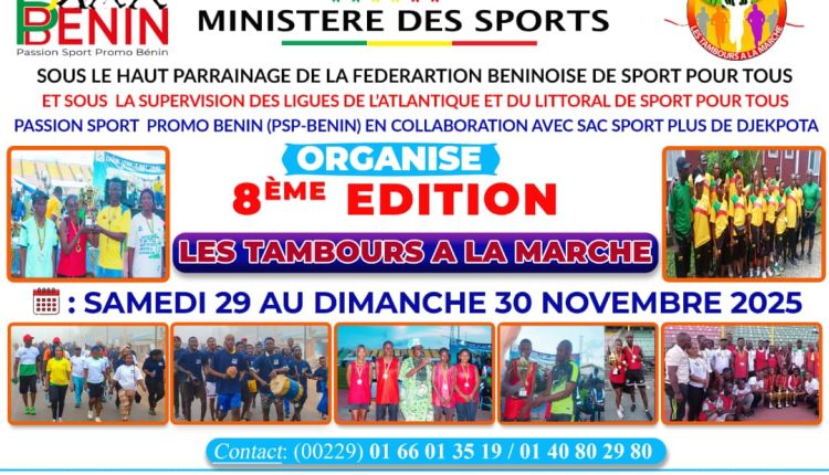 Le dernier week-end de novembre sera placé sous le signe du sport pour Tous, de la santé et de la fraternité. Passion Sport Promo Bénin (PSP-Bénin), en collaboration avec SAC Sport Plus de Djêkpota, organise les samedi 29 et dimanche 30 novembre 2025 la 8ᵉ édition de l’événement sportif et festif « Les Tambours à la Marche », sous la direction du promoteur Degbedi Gustave, coach de randonnée d’endurance avec plus de 12 ans d’expérience.