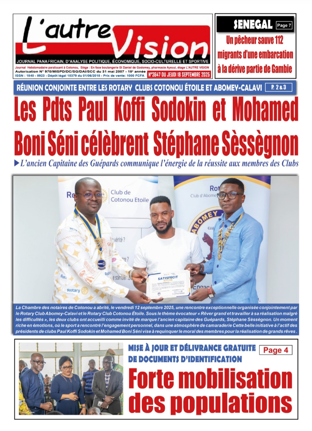 La Chambre des notaires de Cotonou a abrité, le vendredi 12 septembre 2025, une rencontre exceptionnelle organisée conjointement par le Rotary Club Abomey-Calavi et le Rotary Club Cotonou Étoile. Sous le thème évocateur « Rêver grand et travailler à sa réalisation malgré les difficultés », les deux clubs ont accueilli comme invité de marque l’ancien capitaine des Guépards, Stéphane Sèsègnon. Un moment riche en émotions, où le sport a rencontré l’engagement personnel, dans une atmosphère de camaraderie_ _Cette belle initiative à l’actif des présidents de clubs Paul Koffi Sodokin et Mohamed Boni Séni vise à requinquer le moral des membres pour la réalisation de grands rêves